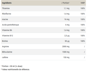 Ingrédients : Eau, acidifiant (acide citrique), L-arginine, bêta-alanine, caféine, niacine, acide pantothénique, biotine, chlorhydrate de thiamine, riboflavine, chlorhydrate de pyridoxine, cyanocobalamine, édulcorants (cyclamate de sodium, acésulfame K, sucralose, saccharine sodique), conservateurs (sorbate de potassium, benzoate de sodium), arôme.