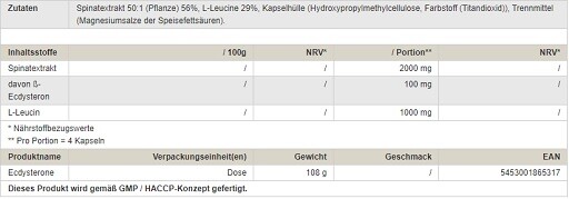 Ingrédients : Extrait d’épinard 50:1 (56 %), L-leucine (29 %), enveloppe de gélule végétale (hydroxypropylméthylcellulose), agent anti-agglomérant (sels de magnésium des acides gras).