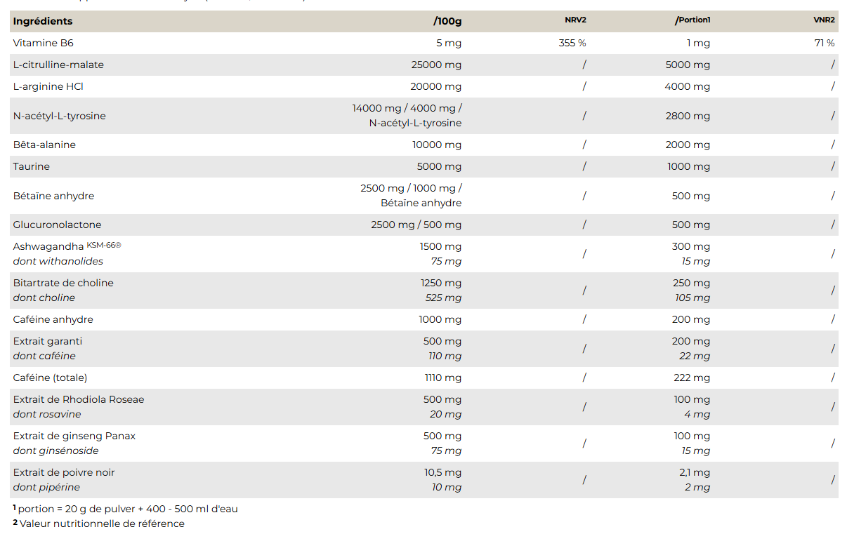 Liste complète des ingrédients : Saveur Crazy Apple : L-Citrulline Malate, L-Arginine Hydrochloride, N-acétyl-L-tyrosine, bêta-alanine, taurine, anti-agglomérant (sels de calcium de l’acide orthophosphorique), arôme, glycine, bétaïne anhydre, glucuronolacétone, colorant (spiruline-, extrait de safran), ashwagandha KSM-66® (racine), bitartrate de choline, caféine, sels de kalium de l’acide citrique, édulcorant (sucralose), extrait de rhodiola rosea (racine), extrait de panax ginseng (racine), extrait de guarana (graines), extrait de poivre noir (fruit), chlorhydrate de pyridoxine.