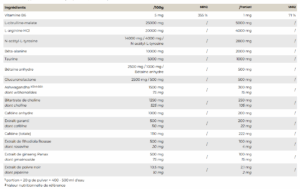 Liste complète des ingrédients : Saveur Crazy Apple : L-Citrulline Malate, L-Arginine Hydrochloride, N-acétyl-L-tyrosine, bêta-alanine, taurine, anti-agglomérant (sels de calcium de l’acide orthophosphorique), arôme, glycine, bétaïne anhydre, glucuronolacétone, colorant (spiruline-, extrait de safran), ashwagandha KSM-66® (racine), bitartrate de choline, caféine, sels de kalium de l’acide citrique, édulcorant (sucralose), extrait de rhodiola rosea (racine), extrait de panax ginseng (racine), extrait de guarana (graines), extrait de poivre noir (fruit), chlorhydrate de pyridoxine.