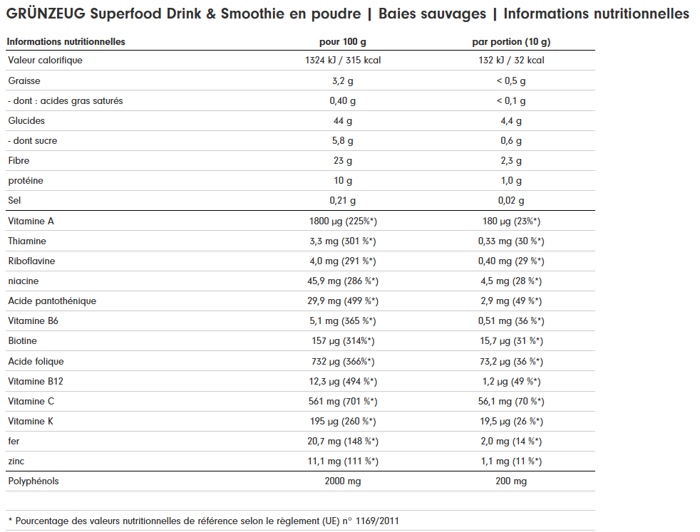 Le GRÜNZEUG est une aide précieuse pour combler des manques en micronutriments, mais il ne doit pas remplacer une alimentation équilibrée. Il complète parfaitement une consommation régulière de fruits et légumes.