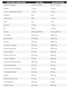 L-citrulline, bêta-alanine (CarnoSyn), acidifiant acide citrique, taurine, N-acétyl-L-tyrosine, extrait de guarana, inuline, arôme, extrait de Rhodiola rosea, colorant alimentaire poudre de jus de betterave, caféine, extrait de racine de ginseng, L-théanine, édulcorants (sucralose, acésulfame K), nicotinamide, extrait de poivre noir.
