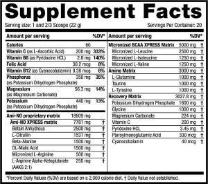 Liste complète des ingrédients : Thé glacé à la pêche : Bétaïne anhydre, L-leucine micronisée, arôme de pêche, arôme de thé noir, phosphate monopotassique, L-citrulline, bêta-alanine, acide DL-malique, L-isoleucine micronisée, L-valine micronisée, glycine, L-glutamine, L-tyrosine, taurine, base de L-agninine micronisée, régulateur d’acidité : acide citrique ; édulcorants : sucralose, acéfamul-K, alpha-cétoglutarate de L-arginine 2:1, carbonate de magnésium, acide L-ascorbique, colorant : caramel ammoniacal ; chlorhydrate de pyridoxine, acide ptéroylmonoglutamique, cyanocobalamine.