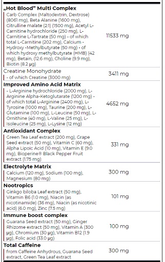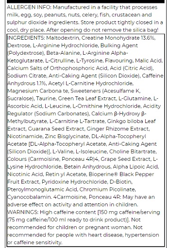 Maltodextrine, monohydrate de créatine 13,6 %, dextrose, chlorhydrate de L-arginine, bêta-alanine, agent de charge (polydextrose), alpha-cétoglutarate de L-arginine, arômes, L-citrulline, L-tyrosine, acide malique, sels de calcium de l’acide orthophosphorique, citrate de sodium, acide (acide citrique), antiagglomérant (silice), caféine anhydre 1,1 %, chlorhydrate d’acétyl-L-carnitine, carbonate de magnésium, édulcorants (acésulfame K, sucralose), taurine, extrait de feuille de thé vert, poudre de betterave [maltodextrine, concentré de betterave, acide (acide citrique)], L-glutamine, acide L-ascorbique, L-leucine, chlorhydrate de L-ornithine, régulateur d’acidité (carbonates de sodium), β-hydroxy-β-méthylbutyrate de calcium, L-carnitine L-tartrate, extrait de feuille de ginkgo biloba, extrait de graine de guarana, extrait de gingembre, nicotinamide, bisglycinate de zinc, Acétate de DL-alpha-tocophéryle [acétate de DL-alpha-tocophéryle,antiagglomérant (silice)], L-valine, L-isoleucine, bitartrate de choline, extrait de pépins de raisin, chlorhydrate de L-lysine, bétaïne anhydre, acide alpha-lipoïque, acide nicotinique, acétate de rétinyle, extrait de poivre noir Bioperine®, chlorhydrate de pyridoxine, D-biotine, acide ptéroylmonoglutamique, picolinate de chrome, cyanocobalamine.