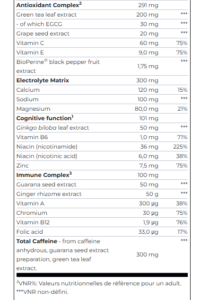 Liste des ingrédients : Maltodextrine, monohydrate de créatine 13,6%, dextrose, L-arginine chlorhydrate, bêta-Alanine, agent de charge (polydextrose), L-arginine alpha-cétoglutarate, L-citrulline, L-tyrosine, acidifiant (acide citrique), arôme, acide malique, sels calciques de l’acide orthophosphorique, citrate de sodium, anti-agglomérant (dioxyde de silicium), caféine anhydre 1,1%, chlorhydrate d’acétyl-L-carnitine, édulcorants (acésulfame K, sucralose), carbonate de magnésium, taurine, extrait de feuilles de thé vert, L-glutamine, extrait de fruit de poivre de Cayenne en poudre [maltodextrine, extrait de poivre, émulsifiant (esters d’acide citrique de mono- et diglycérides d’acides gras), humectant (glycérol), antioxydants (esters d’acides gras de l’acide ascorbique, alpha-tocophérol)], acide L-ascorbique, L-Leucine, chlorhydrate de L-Ornithine, correcteur d’acidité (carbonates de sodium), β-hydroxy β-méthylbutyrate de calcium, L-carnitine-L-tartrate, extrait de feuilles de Ginkgo biloba, préparation d’extrait de graines de guarana (extrait de guarana, caféine), extrait de rhizome de gingembre (extrait de gingembre, maltodextrine), nicotinamide, bisglycinate de zinc [bisglycinate de zinc, glycine, acidifiant (acide citrique), anti-agglomérant (dioxyde de silicium)], acétate de DL-alpha-tocophérol [acétate de DL-alpha-tocophérol, anti-agglomérant (dioxyde de silicium)], L-Valine, L-Isoleucine, choline bitartrate, extrait de pépins de raisin, chlorhydrate de L-lysine, bétaïne, acide nicotinique, acétate de rétinyle [stabilisant (gomme arabique), acétate de rétinyle, antioxydant (alpha-tocophérol), anti-agglomérant (phosphates de calcium)], BioPerine® extrait de fruit de poivre noir, chlorhydrate de pyridoxine, D-biotine, acide ptéroyl-monoglutamique, picolinate de chrome, cyanocobalamine.