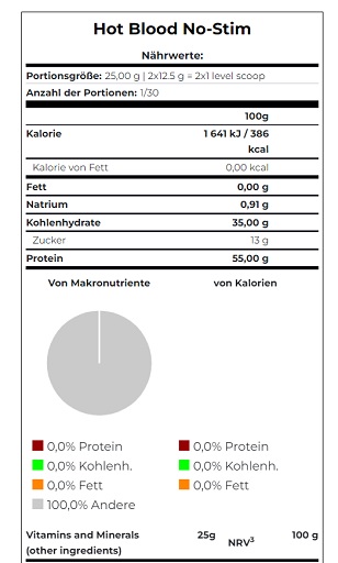 | Complexe Hot Blood* | 11 650 mg | Maltodextrine, dextrose, bêta-alanine 1 400 mg, citrulline 1 200 mg, autres acides aminés |