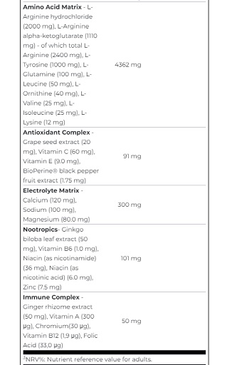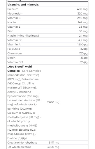 Maltodextrine, monohydrate de créatine 13,6 %, dextrose, chlorhydrate de L-arginine, bêta-alanine, agent de charge (polydextrose), alphakétoglutarate de L-arginine, L-citrulline, L-tyrosine, acide (acide citrique), arôme, acide malique, sels de calcium de l’acide orthophosphorique, citrate de sodium, carbonate de magnésium, antiagglomérant (dioxyde de silicium), chlorhydrate d’acétyl-l-carnitine, édulcorants (acésulfame K, sucralose), L-glutamine, Poudre d’extrait de fruit de poivre de Cayenne [maltodextrine, extrait de poivre, émulsifiant (esters d’acide citrique de mono- et diglycérides d’acides gras), humectant (glycérol), antioxydant (esters d’acides gras d’acide ascorbique, alpha-tocophérol)], acide L-ascorbique, extrait de gingembre (extrait de rhizome de gingembre, maltodextrine), chlorhydrate de L-ornithine, L-leucine, SS-hydroxy SS-méthylbutyrate de calcium, L-carnitine L-tartrate, extrait de feuille de Ginkgo Biloba,Régulateur d’acidité (carbonates de sodium), bisglycinate de zinc [bisglycinate de zinc, glycine, acide (acide citrique), antiagglomérant (dioxyde de silicium)], nicotinamide, acétate de dl-alpha-tocophéryle [acétate de dl-alpha-tocophéryle, antiagglomérant (dioxyde de silicium)], L-valine, L-isoleucine, bitartrate de choline, extrait de pépins de raisin, chlorhydrate de L-lysine, bétaïne, acide nicotinique, Acétate de rétinyle [stabilisant (gomme arabique), acétate de rétinyle, antioxydant (alpha-tocophérol), antiagglomérant (phosphates de calcium)], biopérine® Extrait de fruit de poivre noir, chlorhydrate de pyridoxine, D-biotine, acide ptéroylmonoglutamique, picolinate de chrome, cyanocobalamineAgent antiagglomérant (dioxyde de silicium)], L-valine, L-isoleucine, bitartrate de choline, extrait de pépins de raisin, chlorhydrate de L-lysine, bétaïne, acide nicotinique, acétate de rétinyle [stabilisant (gomme arabique), acétate de rétinyle, antioxydant (alpha-tocophérol), agent antiagglomérant (phosphates de calcium)], biopérine® Extrait de fruit de poivre noir, chlorhydrate de pyridoxine, D-biotine, acide ptéroylmonoglutamique, picolinate de chrome, cyanocobalamineAgent antiagglomérant (dioxyde de silicium)], L-valine, L-isoleucine, bitartrate de choline, extrait de pépins de raisin, chlorhydrate de L-lysine, bétaïne, acide nicotinique, acétate de rétinyle [stabilisant (gomme arabique), acétate de rétinyle, antioxydant (alpha-tocophérol), agent antiagglomérant (phosphates de calcium)], biopérine® Extrait de fruit de poivre noir, chlorhydrate de pyridoxine, D-biotine, acide ptéroylmonoglutamique, picolinate de chrome, cyanocobalamine.