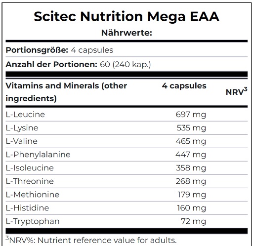 Le complément alimentaire Scitec® Mega EAA se présente sous forme de 240 capsules contenant un mélange complet des acides aminés essentiels (EAA) dans des proportions recommandées par l’Organisation mondiale de la santé (OMS). Ce produit est formulé pour apporter les acides aminés indispensables que le corps ne peut pas synthétiser lui-même, notamment la L-Valine, la L-Phénylalanine, la L-Isoleucine, la L-Thréonine, la L-Méthionine et la L-Histidine.