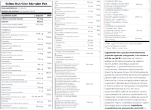 Monster Pak apporte un cocktail puissant de 3 types de créatines favorisant la force et l’endurance musculaire, un complexe enzymatique et “greens” pour la digestion et la vitalité, des acides gras essentiels pour la santé cardiovasculaire, ainsi qu’un stimulant naturel grâce à la caféine. Sa matrice “cycle de Krebs – ATP” optimise la production d’énergie cellulaire, tandis que le précurseur de l’oxyde nitrique (L-Arginine) participe à une meilleure vascularisation musculaire. Le complexe inclut également des agents protecteurs articulaires (glucosamine, chondroïtine, MSM) et un spectre complet d’acides aminés indispensables, dont les BCAA. Résultat : une formule synergiquement conçue pour améliorer la performance sportive, accélérer la récupération et soutenir la santé générale.
