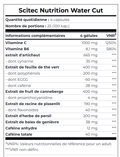 Water Cut ne doit pas être utilisé par les femmes enceintes ou allaitantes, les personnes sensibles à la caféine, souffrant d’hypertension, de troubles cardiaques, ou prenant certains médicaments sans avis médical préalable. Le produit ne remplace pas une alimentation équilibrée ni un mode de vie sain.