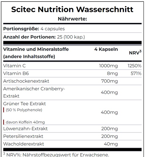 Liste complète des ingrédients : Acide ascorbique, extrait d’artichaut (Cynara scolymus), gélatine bovine (capsule), extrait de thé vert (Camellia sinensis), extrait de canneberge (Vaccinium macrocarpon), extrait de pissenlit (Taraxacum officinale), extrait de persil (Petroselinum crispum), stéarate de magnésium, extrait de genièvre (Juniperus communis), chlorhydrate de pyridoxine, colorants (Candurin Silver Fine, oxyde de fer noir, Brilliant Black BN).