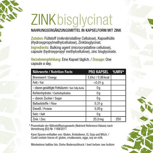 Liste complète des ingrédients : Zinc aminé chélaté (25 mg de zinc par capsule), cellulose, capsule végétale (hydroxypropylméthylcellulose), stéarate de magnésium d’origine végétale.