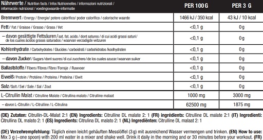 Ingrédients : 100% Citrulline D,L-Malate (L-Citrulline Malate)