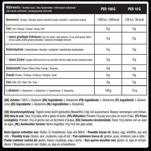Ingrédients : L-Glutamine 100% pure (poudre).