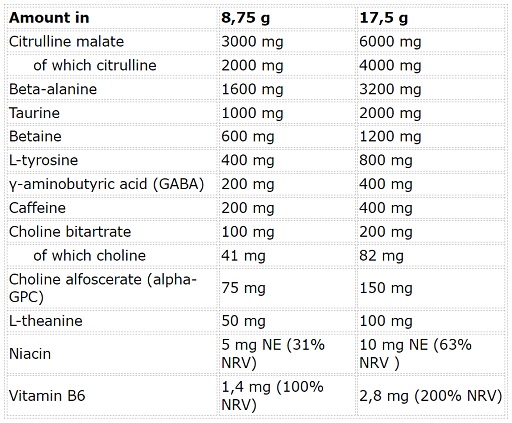 Citrulline malate, bêta-alanine, taurine, betaine anhydrous, agent antiagglomérant (E551), L-tyrosine, régulateur d’acidité (E500(ii)), arômes, choline tartrate, GABA, caféine anhydre, sel, niacine (acide nicotinique), vitamine B6 (chlorhydrate de pyridoxine), concentré de jus de betterave, concentré de carotte noire, édulcorants (acesulfame K, sucralose, glycosides de stévia), colorants (E160a, E104, E132). Note : E104 peut affecter l’attention chez les enfants.