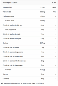 Liste complète des ingrédients : Caféine anhydre, agent d’enrobage (hydroxypropylméthylcellulose), extrait de thé vert (Camellia sinensis, feuilles) standardisé à 50% de polyphenols, extrait de maté (Ilex paraguariensis, feuille), bitartrate de choline, extrait de raisin (Vitis vinifera, feuilles), extrait de nopal (Opuntia ficus indica, fruit), extrait de guarana (Paullinia cupana, graines), extrait de piment doux (Capsicum annuum, fruit), extrait d’éleuthérocoque (Eleutherococcus senticosus, racine), extrait de framboisier (Rubus idaeus, fruit) titré à 0.005% de cétones, taurine, acétyl-L-Carnitine, colorant (oxyde de fer noir), chlorhydrate de pyridoxine (vitamine B6), cyanocobalamine (vitamine B12).