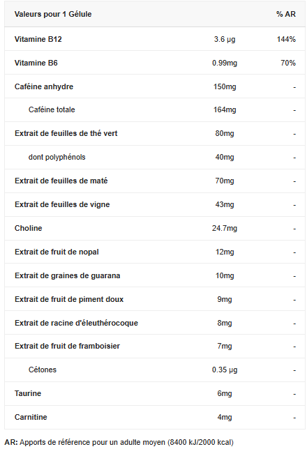 Liste complète des ingrédients : Caféine anhydre, agent d’enrobage (hydroxypropylméthylcellulose), extrait de thé vert (Camellia sinensis, feuilles) standardisé à 50% de polyphenols, extrait de maté (Ilex paraguariensis, feuille), bitartrate de choline, extrait de raisin (Vitis vinifera, feuilles), extrait de nopal (Opuntia ficus indica, fruit), extrait de guarana (Paullinia cupana, graines), extrait de piment doux (Capsicum annuum, fruit), extrait d’éleuthérocoque (Eleutherococcus senticosus, racine), extrait de framboisier (Rubus idaeus, fruit) titré à 0.005% de cétones, taurine, acétyl-L-Carnitine, colorant (oxyde de fer noir), chlorhydrate de pyridoxine (vitamine B6), cyanocobalamine (vitamine B12).