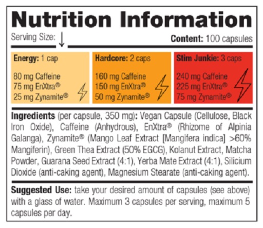 Liste complète des ingrédients : Caféine, Zynamite® (extrait de feuille de mangue), EnXtra® (extrait de feuille de thé), extrait de thé vert, poudre de matcha, L-Théanine, N-Acétyl-L-Tyrosine, choline bitartrate, huperzine-A, capsules (gélatine), antiagglomérants (stéarate de magnésium).