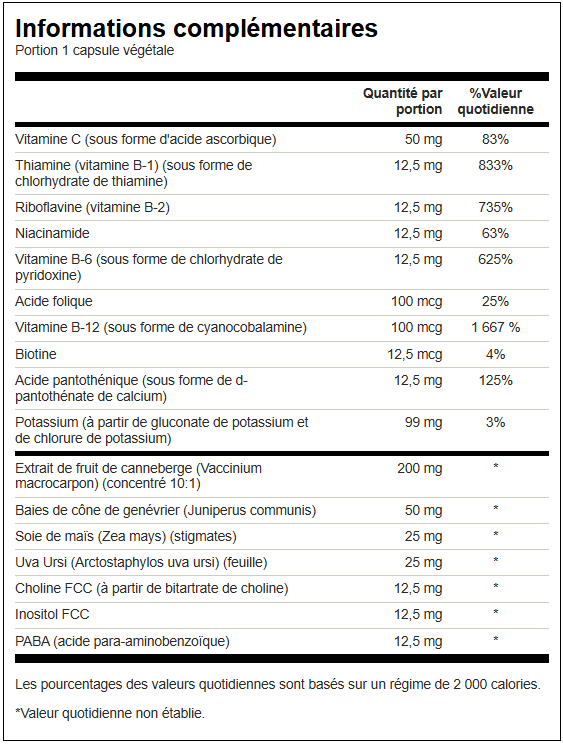 Liste complète des ingrédients : Vitamine C (acide ascorbique), thiamine HCl, riboflavine, niacinamide, acide pantothénique (d-calcium pantothénate), vitamine B6 (chlorhydrate de pyridoxine), acide folique, vitamine B12 (cyanocobalamine), biotine, potassium (gluconate et chlorure), extrait de canneberge (vaccinium macrocarpon), extrait de baies de genièvre, extrait de racine d’astragale, extrait de soie de maïs, hypromellose (capsule végétale), farine de riz, L-leucine, silice.