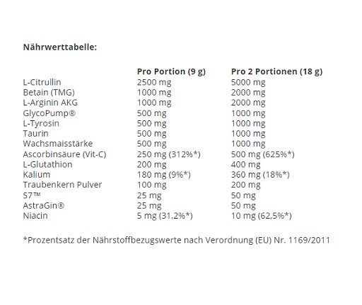 Ingrédients : L-citrulline, triméthylglycine (betaine), arginine alpha-ketoglutarate, GlycoPump® (glycérol en poudre 65 %), L-tyrosine, taurine, citrate de potassium, amidon de maïs cireux, agents anti-agglomérants (silice, phosphate tricalcique), régulateur d’acidité (acide malique), acide ascorbique (vitamine C), L-glutathion, poudre de pépins de raisin, édulcorants (aspartame, acésulfame K), curcuma, arômes naturels, S7™ (extraits de grain de café vert, thé vert, curcuma, cerise aigre, myrtille, brocoli et chou kale), AstraGin® (extraits d’astragale et de ginseng), colorants naturels (rouge de betterave, riboflavine), niacine. Contient une source de phénylalanine.