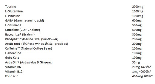 Ingrédients : Mélange actif : Caféine naturelle (Coffeine™), GABA, tyrosine, taurine, L-glutamine, citicoline (CDP Choline), Bacognize® (Bacopa Monnieri), extrait de Lionsmane, rhodiola rosea (racine d’arctique), phosphatidylsérine, theanine, gotu kola, AstraGin®, aronia, acide ascorbique (vitamine C), agent de saveur naturelle mojito, agents de charge et anti-agglomérants conformes.