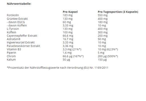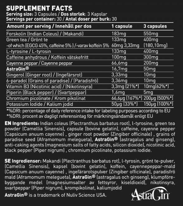 Liste des ingrédients : Caféine anhydre, poivre de Cayenne, AstraGin® (mélange d’extraits d’Astragalus membranaceus et de Panax notoginseng), extrait de racine de gingembre (Gingerol), extrait de graines du paradis (6-Paradol), agents anti-agglomérants (carbonate de magnésium), capsule gélatine bovine.