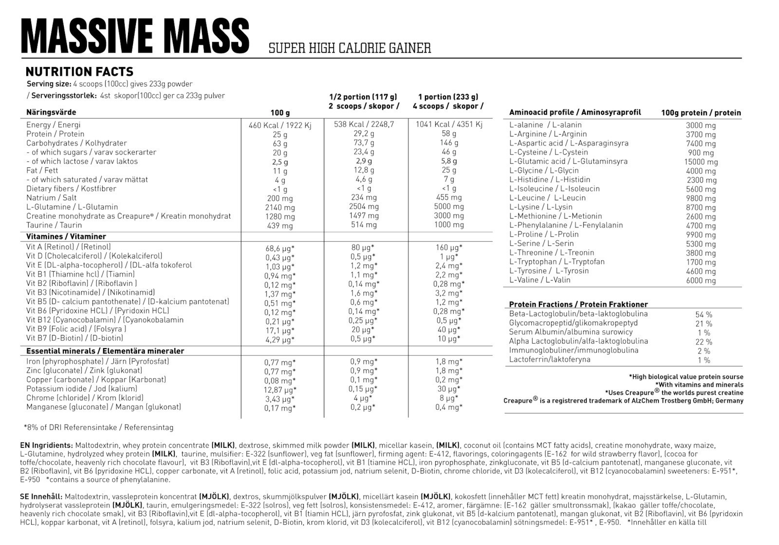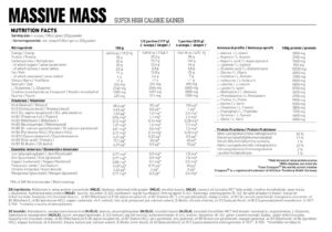 Massive Mass combine une formulation sophistiquée mêlant protéines à absorption rapide et lente, glucides et acides aminés essentiels. Sa synergie unique inclut des protéines hydrolysées de whey, de la caséine micellaire, du maltodextrin et de la dextrose qui permettent une diffusion progressive et soutenue d’énergie et de nutriments. Enrichi en 3 g de créatine monohydrate Creapure® pour augmenter le volume musculaire et 1 g de taurine pour optimiser l’explosivité, il apporte aussi 10,7 g de BCAA par prise pour une récupération accélérée. Ce gainer est donc idéal pour ceux qui désirent augmenter rapidement leur apport calorique avec une composition nutritive de haute qualité.