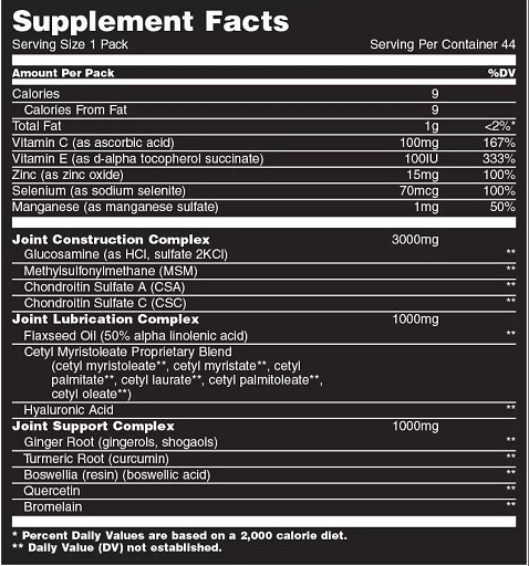Liste des ingrédients : Glucosamine sulfate, glucosamine hydrochloride, chondroïtine sulfate, MSM, collagène hydrolysé, acide hyaluronique, huile de lin, extrait de curcuma (curcumine), extrait de boswellia, extrait de racine de gingembre, vitamine C (acide ascorbique), vitamine E (d-alpha tocophérol), zinc (gluconate de zinc), sélénium (sélénométhionine), manganèse (sulfate de manganèse), agents de charge, enveloppe du comprimé.