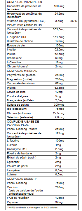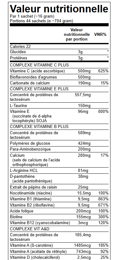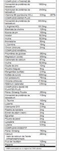Vitamin C Plus Complex( acide ascorbique( Vitamine C), bioflavonoïdes agrumes, sels calciques de l’acide orthophosphorique, agent de charge( cellulose microcristalline), anti-agglomérants( acide stéarique, stéarate de magnésium, dioxyde de silicium), agent d’enrobage( glaçure pharmaceutique)), Vitamin E Plus Complex( sels calciques de l’acide orthophosphorique, poudre de racine de Panax ginseng, CONCENTRé DE PROTéINE DE LACTOSéRUM (LAIT)( émulsifiant( LéCITHINE DE SOJA)), agent de charge( cellulose microcristalline), anti-agglomérants( acide stéarique, dioxyde de silicium, stéarate de magnésium), L-taurine, SUCCINATE ACIDE DE D-ALPHA-TOCOPHéRYLE (SOJA), poudre de baies d’aubépine, agent d’enrobage( glaçure pharmaceutique)), Amino Plus Complex( agent de charge( sels calciques de l’acide orthophosphorique, cellulose microcristalline), CONCENTRé DE PROTéINE DE LACTOSéRUM (LAIT)( émulsifiant( LéCITHINE DE SOJA)), chlorhydrate de L-arginine, anti-agglomérants( dioxyde de silicium, acide stéarique, stéarate de magnésium), bitartrate de choline, extrait d’écorce de pin, inositol, inuline, broméline, L-carnitine tartrate, chlorure de chrome, agent d’enrobage( glaçure pharmaceutique)), Herbal Plus Complex( agent de charge( sels calciques de l’acide orthophosphorique, cellulose microcristalline), CONCENTRé DE PROTéINE DE LACTOSéRUM (LAIT)( émulsifiant( LéCITHINE DE SOJA)), poudre de racine de Panax ginseng, L-taurine, anti-agglomérants( acide stéarique, stéarate de magnésium, dioxyde de silicium), papaïne, bêta-carotène( Vitamine A), poudre de luzerne, acétate de rétinyle( Vitamine A), coenzyme Q10, feuilles de persil en poudre, poudre de racine de bardane, son de riz, poudre de fruits de cynorrhodon, cholécalciférol( vitamine D), lycopène, lutéine, agent d’enrobage( glaçure pharmaceutique)), Vitamin B Plus Complex( sels calciques de l’acide orthophosphorique, CONCENTRé DE PROTéINE DE LACTOSéRUM (LAIT)( émulsifiant( LéCITHINE DE SOJA)), polymères de glucose, acide para-aminobenzoïque , chlorhydrate de L-arginine, D-pantothénate de calcium( Acide Pantothénique), anti-agglomérants( acide stéarique, stéarate de magnésium, dioxyde de silicium), extrait de pépins de raisin, D-biotine( biotine), nicotinamide( Niacine), mononitrate de thiamine( Vitamine B1), Riboflavine( Vitamine B2), chlorhydrate de pyridoxine( Vitamine B6), acide ptéroylmonoglutamique( Acide Folique), cyanocobalamine( Vitamine B12), agent d’enrobage( glaçure pharmaceutique)), Multi-Mineral Complex( oxyde de magnésium, polymères de glucose, carbonate de calcium, agent de charge( cellulose microcristalline), inuline, anti-agglomérants( acide stéarique, stéarate de magnésium), citrate de calcium, oxyde de zinc, sulfate de manganèse, laminaires en poudre (plante entier), iodure de potassium, sulfate de cuivre, chlorure de chrome, sélénite de sodium, agent d’enrobage( glaçure pharmaceutique)), Vitamin B6 Complex( CONCENTRé DE PROTéINE DE LACTOSéRUM (LAIT)( émulsifiant( LéCITHINE DE SOJA)), agent de charge( sels calciques de l’acide orthophosphorique), anti-agglomérants( acide stéarique, stéarate de magnésium), HYDROLYSATS DE PROTéINES DE LACTOSéRUM (LAIT)( émulsifiant( LéCITHINE DE SOJA)), chlorhydrate de pyridoxine( Vitamine B6), agent d’enrobage( glaçure pharmaceutique).