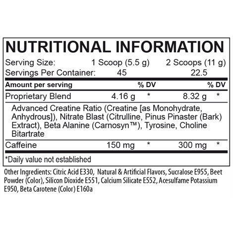 L-citrulline, bêta-alanine (Carnosyn™), créatine monohydrate, tyrosine, choline bitartrate, créatine anhydre, caféine, extrait d’écorce de Pinus pinaster, acide malique (E296), arômes naturels et artificiels, sucralose (E955), betterave en poudre (colorant), dioxyde de silicium (E551), silicate de calcium (E552), acésulfame K (E950).