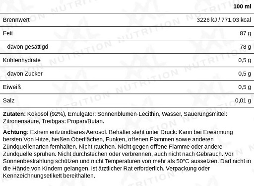 Liste complète des ingrédients (variable selon variante) : Mélange spécifique d’huiles végétales adaptées à la cuisson (ex. huile de tournesol, huile de noix de coco 92% ou huile d’olive 95%), agents propulseurs (gaz inertes, propane / butane), éventuellement arômes naturels selon la variante.